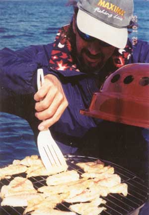 I filleted some of the Whitefish and Chef Andy grilled them on the bow for fish tacos, chips salsa and the best triangular cut home made brownies I’ve ever eaten. We rested for a couple of hours and waited for the mid day winds to stop blowing for the evening. While the rest of us talk Fishhead continued to catch some nice whitefish off the back of the boat. |